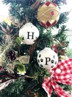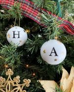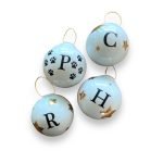 Enfeite de árvore porcelana, com estrelas ouro ou patinhas pretas. Escolha o seu modelo preferido e personalize com a inicial da família toda!