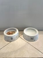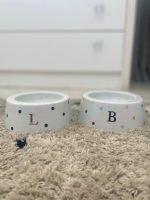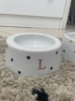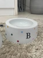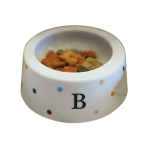 Comedouro para Pet em porcelana, com decoração de poás coloridos e inicial preta ou pretos e inicial em ouro.