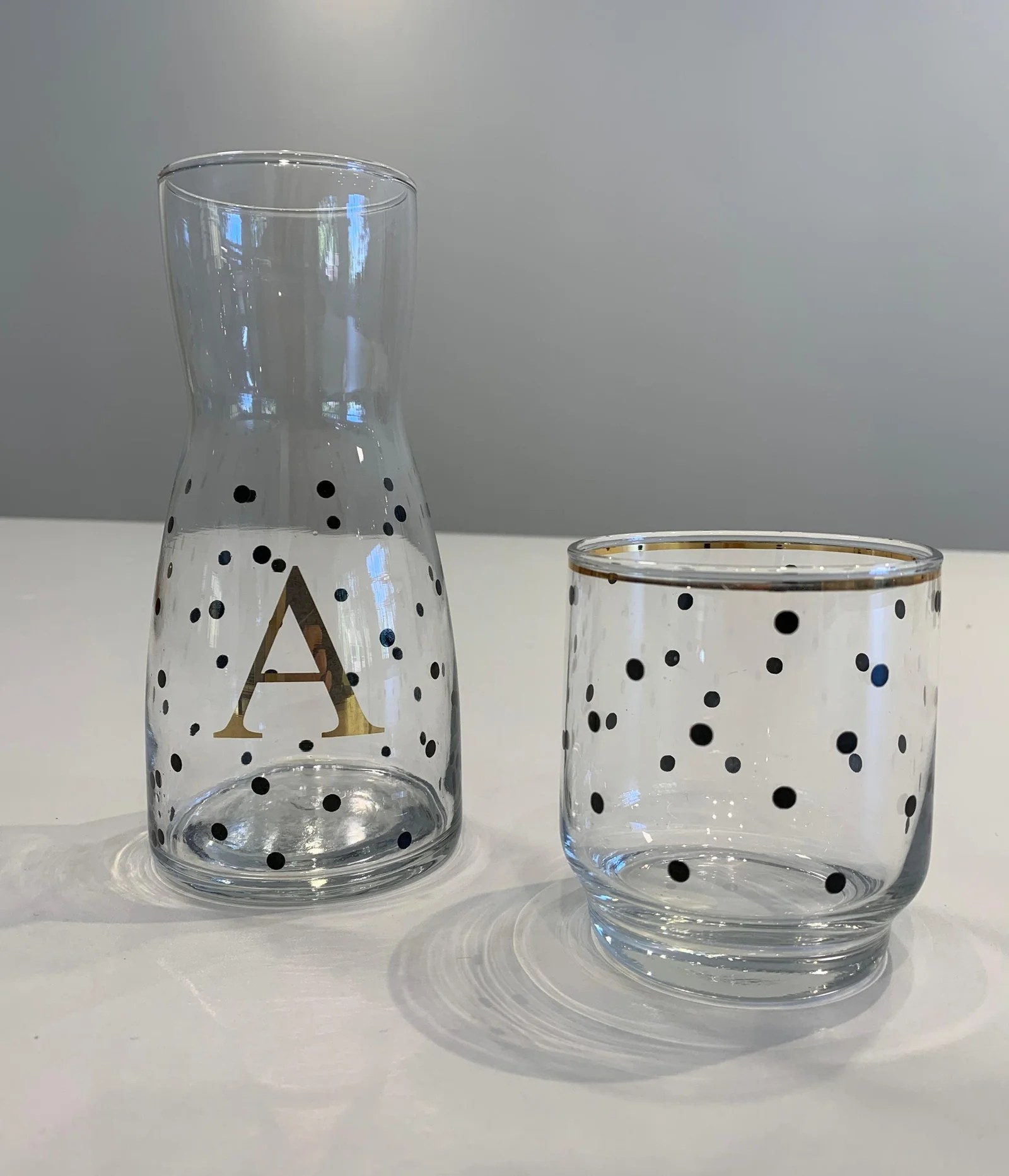Que tal deixar seu cantinho ainda mais encantador com essa moringa de vidro super charmosa? Ela vem com uma linda decoração: inicial em ouro e uma estampa fofíssima de poá, perfeita para você se hidratar com estilo e delicadeza!