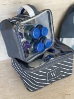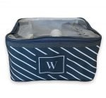Necessaire em tecido oxford dublado com plástico cristal, fechamento com zíper e alça.